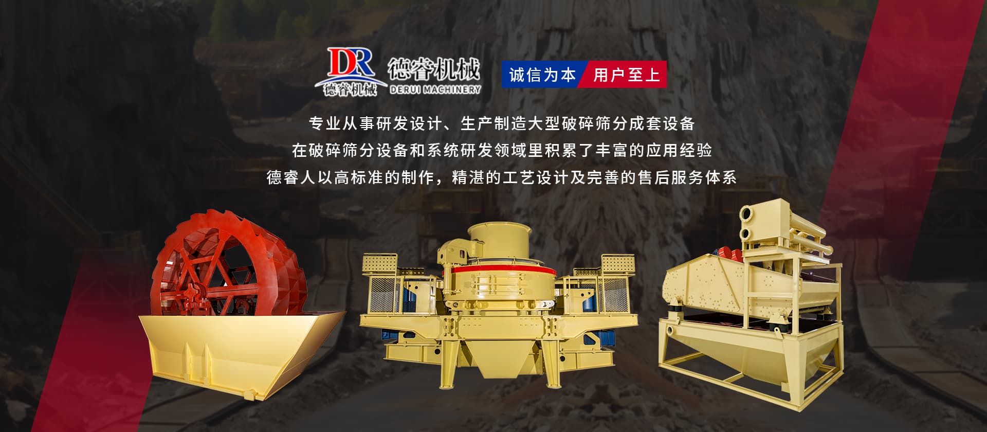“誠(chéng)信為本,用戶(hù)至上”德睿人以高標(biāo)準(zhǔn)的制作,精湛的工藝設(shè)計(jì)及完善的售后服務(wù)體系在破碎篩分設(shè)備和系統(tǒng)研發(fā)領(lǐng)域里積累了豐富的應(yīng)用經(jīng)驗(yàn)。借助在破碎行業(yè)的豐富經(jīng)驗(yàn),公司可向客戶(hù)提供碎石制砂生產(chǎn)線(xiàn)設(shè)計(jì)、安裝、調(diào)試等交鑰匙工程,同時(shí)承接破碎系統(tǒng)的爆破、裝運(yùn)、破碎等生產(chǎn)運(yùn)行總承包。